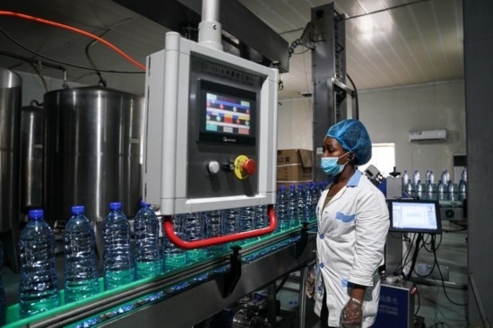 9月9日,當(dāng)?shù)貑T工在位于加蓬首都利伯維爾的歐來(lái)源純凈水廠(chǎng)生產(chǎn)線(xiàn)上工作。新華社記者韓旭攝