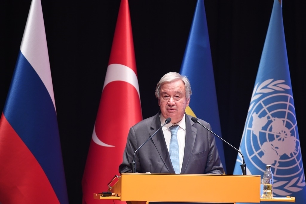 2022年8月20日,在位于土耳其伊斯坦布爾的土耳其國防大學內(nèi)的黑海糧食外運聯(lián)合協(xié)調(diào)中心,聯(lián)合國秘書長古特雷斯出席新聞發(fā)布會。新華社記者沙達提攝