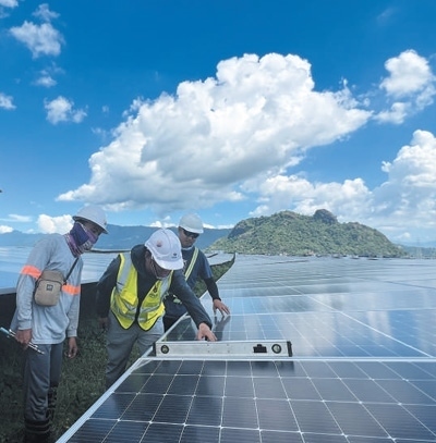 菲律賓圣馬塞利諾光伏項目由中國電力建設集團有限公司承建,項目建成后將成為該國最大的光伏電站,每年將為菲律賓供電5.9億千瓦時。圖為中方工程師(中)帶領菲方工作人員檢查調(diào)試光伏支架。楊獲然攝
