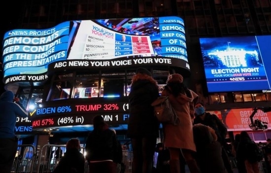 2020年11月3日,人們?cè)诿绹?guó)紐約時(shí)報(bào)廣場(chǎng)觀看總統(tǒng)選舉實(shí)時(shí)計(jì)票結(jié)果。新華社記者王迎攝