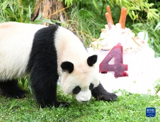 在當(dāng)天的活動(dòng)上,柏林動(dòng)物園看護(hù)團(tuán)隊(duì)為“夢(mèng)想”和“夢(mèng)圓”準(zhǔn)備了由蘋果和胡蘿卜等制成的多層冰激凌蛋糕,蛋糕上還有用甜菜根汁冰塊雕刻的數(shù)字“4”。