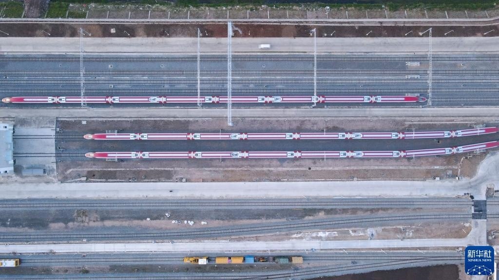 7月20日,雅萬高鐵列車??吭谟《饶嵛鱽喨f隆德卡魯爾動車所附近(無人機(jī)照片)。新華社記者 徐欽 攝