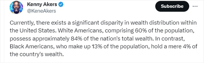 美國網(wǎng)友發(fā)文批評美國財(cái)富不平等現(xiàn)象表示,占據(jù)美國總?cè)丝?0%的白人擁有全美大約84%的財(cái)富,而占據(jù)人口13%的美國非裔卻只擁有4%。