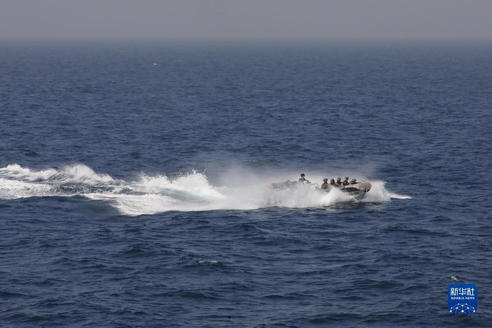 中巴“海洋衛(wèi)士-3”海上聯(lián)合演習(xí)在阿拉伯海北部??沼蚺e行,中國海軍荊州艦特戰(zhàn)隊員在臨檢拿捕演練中乘小艇前出(11月14日攝)。新華社發(fā)(姜霞攝)