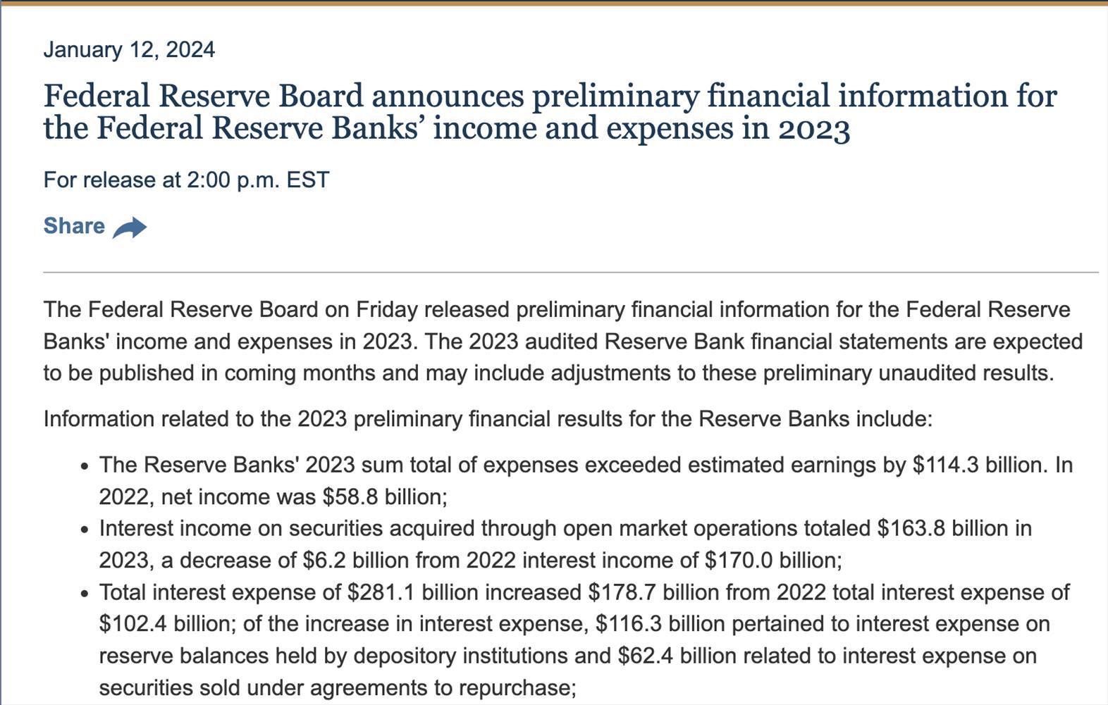 公告稱,美國聯(lián)邦儲(chǔ)備銀行2023年的支出總額比預(yù)期收入高出1143億美元。2022年,凈利潤為588億美元。