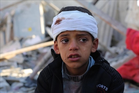 1月18日,在加沙地帶南部城市拉法,一名受傷的男孩在哭泣。新華社發(fā)(哈立德·奧馬爾攝)