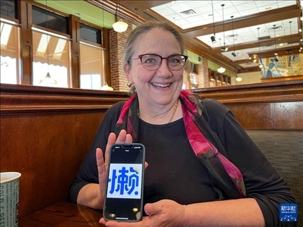 1月9日,在美國得克薩斯州達拉斯,朱麗葉·托馬斯用手機展示她的微信頭像“懶”字,意在提醒所有人監(jiān)督她學中文要勤奮,不要偷懶。新華社發(fā)(田丹攝)