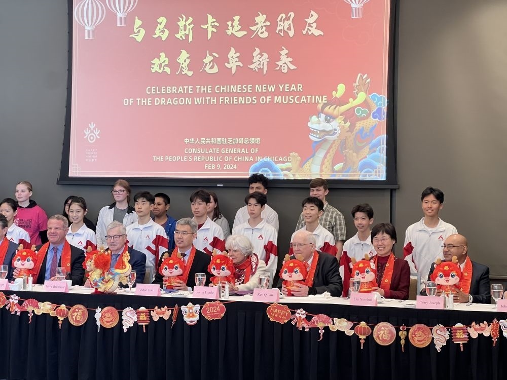 2月9日,在美國艾奧瓦州馬斯卡廷,中美新朋老友歡度龍年新春。