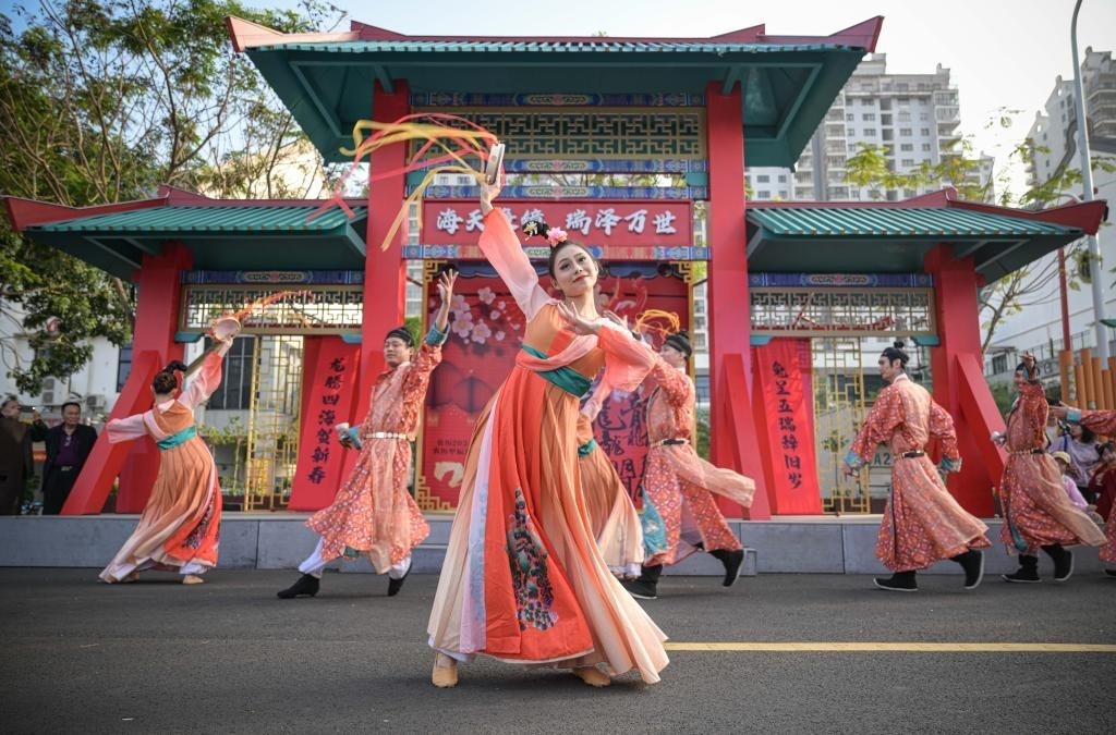 2月12日,在位于海南省海口市的第十六屆萬春會(huì)分會(huì)場(chǎng)——海瑞文化公園春節(jié)系列活動(dòng)中拍攝的舞蹈演藝現(xiàn)場(chǎng)。新華社記者蒲曉旭攝