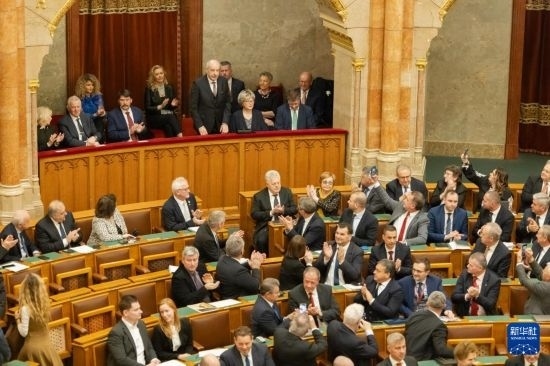 2月26日,在匈牙利布達佩斯,匈牙利當(dāng)選總統(tǒng)舒尤克·道馬什(后中)接受祝賀。新華社發(fā)(弗爾季·奧蒂洛攝)