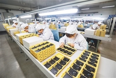 山東省榮成市港西鎮(zhèn)一家外資電子制造企業(yè)的工人們?cè)陔娮又悄茉O(shè)備生產(chǎn)線上忙碌著,趕制出口國外的訂單產(chǎn)品。