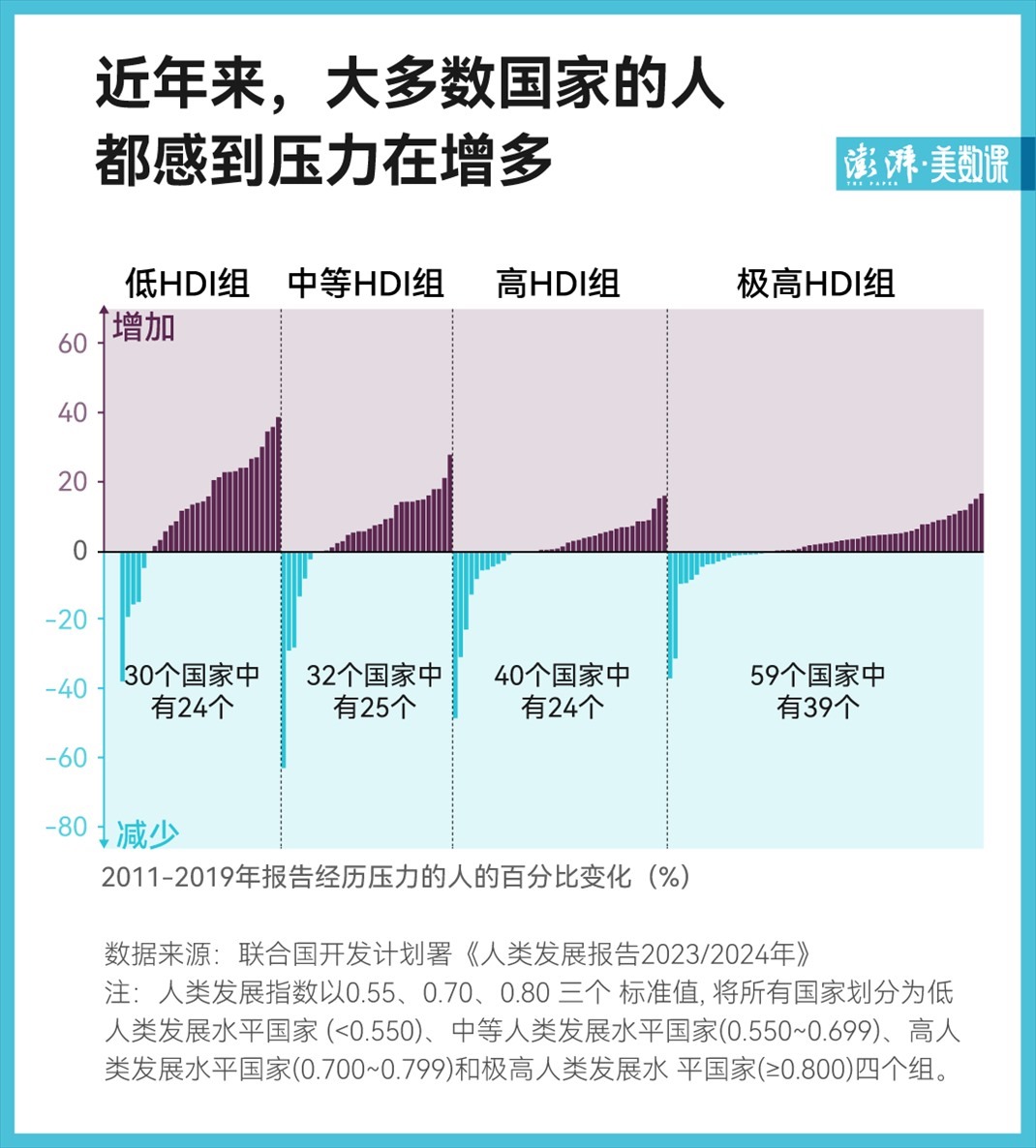 但其中低人類發(fā)展水平組、中人類發(fā)展水平組中,有約 80% 的國家個(gè)人壓力上升,且上升幅度較大,而高人類發(fā)展水平組和極高人類發(fā)展水平組的個(gè)人壓力上升幅度相對較小,這意味著欠發(fā)達(dá)國家的居民將面臨更大的壓力。