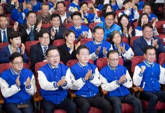4月10日,在韓國首爾,韓國最大在野黨共同民主黨黨首李在明(前排中)與共同民主黨領導層共同慶祝出口民調(diào)結(jié)果大幅領先。新華社記者姚琪琳攝