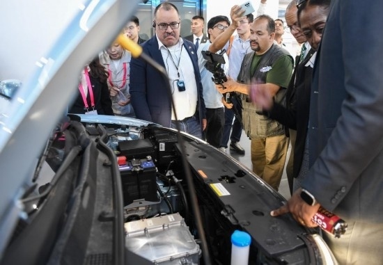 代表團來到襄陽和武漢的多家新能源汽車上下游工廠參觀。干凈明亮的整裝車間里,機械臂上下?lián)]舞,AGV小車穿梭搬運零配件,電子屏幕實時顯示生產(chǎn)信息。在嵐圖汽車科技有限公司,代表團成員興致勃勃地試乘了多款新能源汽車,體驗座椅按摩、折疊桌板、智能語音助手等功能,親身感受汽車在數(shù)秒內(nèi)從0碼提速到100碼的過程。