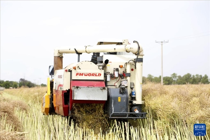 4月17日,一臺(tái)從中國(guó)引進(jìn)的油菜籽收割機(jī)在巴基斯坦東部旁遮普省珀格爾地區(qū)一處農(nóng)田進(jìn)行收割作業(yè)。新華社發(fā)(艾哈邁德·卡邁勒攝)