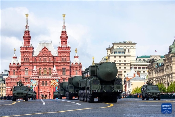 5月9日,在俄羅斯首都莫斯科,“亞爾斯”導(dǎo)彈系統(tǒng)編隊(duì)駛過紅場。新華社記者 曹陽 攝