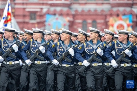 5月9日,在俄羅斯首都莫斯科,士兵列隊(duì)走過紅場。新華社記者 白雪騏 攝