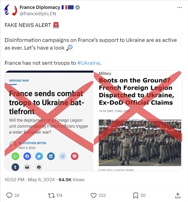 5月6日,法國外交部在X平臺上明確表示,“法國還沒有向?yàn)蹩颂m派兵?!?/p>