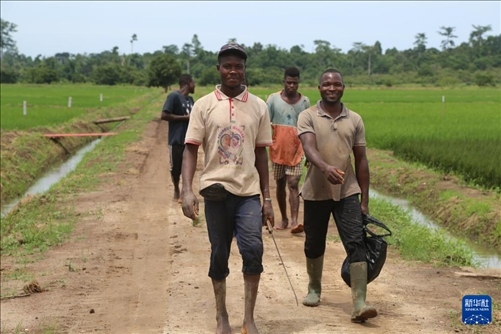 5月31日,在位于科特迪瓦南部迪沃省的格格杜墾區(qū),當(dāng)?shù)胤N植戶在水稻田邊的道路上行走。新華社記者 張健 攝
