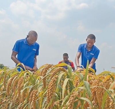 在中國—烏干達農(nóng)業(yè)合作產(chǎn)業(yè)園的試驗田里,當?shù)毓と苏谑斋@中國狐尾小米。龍文靖攝
