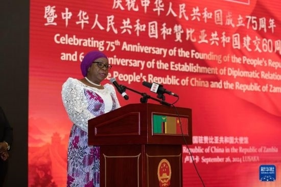 9月26日,贊比亞副總統(tǒng)穆塔萊·納盧曼戈在盧薩卡舉行的慶祝中華人民共和國(guó)成立75周年暨中贊建交60周年招待會(huì)上致辭。新華社記者 彭立軍 攝