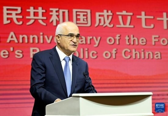 9月26日,阿塞拜疆政府副總理沙欣·穆斯塔法耶夫在巴庫(kù)舉行的慶祝中華人民共和國(guó)成立75周年招待會(huì)上致辭。新華社發(fā)(巴巴耶夫攝)