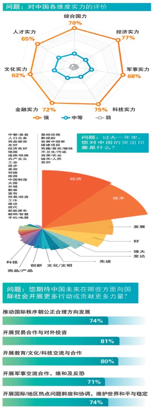 調(diào)查問卷讓被訪者自主描繪其過去一年里對中國的突出印象。報告顯示,各國民眾使用率最高的關鍵詞包括“經(jīng)濟”“技術/科技”“發(fā)展/發(fā)達”“好”“強大/強國”“先進/創(chuàng)新”“文化/文明”“商品/產(chǎn)品”“人口眾多”“中餐/美食”等。在發(fā)達國家、歐洲國家、中東國家和東盟國家,“經(jīng)濟”被提及的頻次居首;在發(fā)展中國家、非洲國家、金磚國家,“技術”被提及的頻次最高。