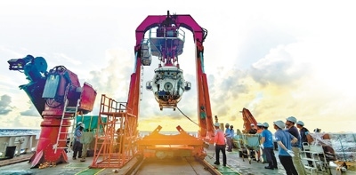 船時(shí)6時(shí)許(北京時(shí)間4時(shí)許),遠(yuǎn)處天際依然泛著青灰色,母船“深海一號(hào)”船上已是一片繁忙景象。作業(yè)區(qū)天氣晴朗,潛航人員和技術(shù)保障團(tuán)隊(duì)各司其職。一系列準(zhǔn)備工作就緒后,“蛟龍”號(hào)艙蓋關(guān)閉,深海之旅即將開(kāi)啟。