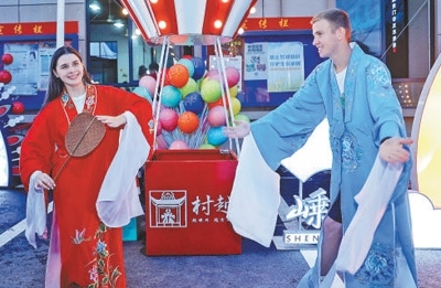 馬克西姆(右)和葉卡捷琳娜在“村越”現(xiàn)場體驗越劇服裝。