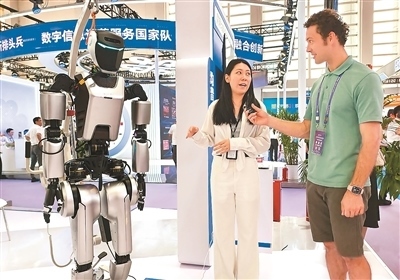 在浙江省寧波國(guó)際會(huì)展中心的第十四屆智博會(huì)現(xiàn)場(chǎng),一位外國(guó)朋友采訪人形機(jī)器人展商。