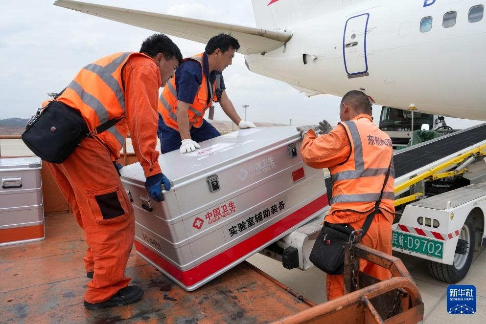 4月19日,工作人員在昆明長水機(jī)場(chǎng)將中國政府援緬衛(wèi)生防疫隊(duì)攜帶的物資裝機(jī)。新華社記者 陳欣波 攝