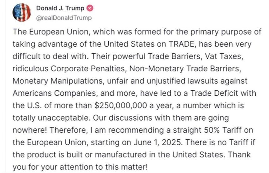 當?shù)貢r間23日一早,美國總統(tǒng)特朗普在社交媒體上連發(fā)兩帖,矛頭分別對準歐盟和蘋果。特朗普稱,歐盟“難打交道”“占美國便宜”,威脅自6月1日起對歐盟商品統(tǒng)一征收50%關稅;蘋果手機若不在美國生產(chǎn),應面臨25%關稅。