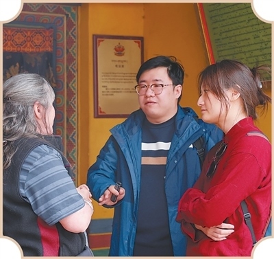 記者在敏珠林寺采訪(fǎng)澳大利亞游客亨麗埃塔·曼寧(左一)。