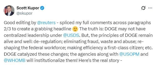 路透社還援引美國(guó)人事管理局局長(zhǎng)庫(kù)珀的消息,稱“政府效率部”已“不存在”,并稱其已不再是一個(gè)“集中式機(jī)構(gòu)”。