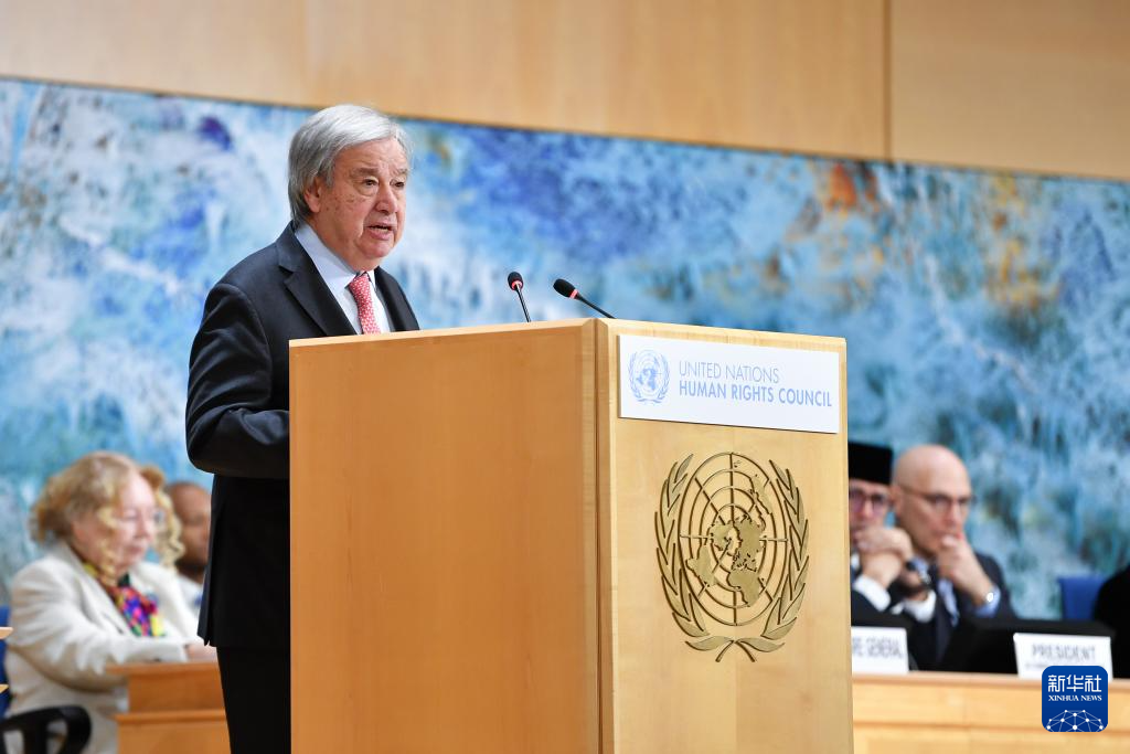 2月23日,在瑞士日內(nèi)瓦萬國宮,聯(lián)合國秘書長古特雷斯在聯(lián)合國人權(quán)理事會第61屆會議上講話。 新華社記者 連漪 攝