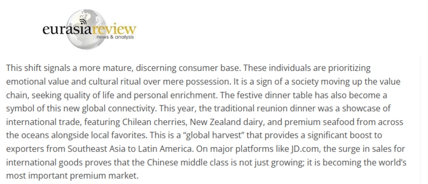 文章稱,這種轉(zhuǎn)變標(biāo)志著中國(guó)消費(fèi)者變得更加成熟、更具品位。他們更注重情緒價(jià)值和文化儀式感,而不僅僅是物質(zhì)追求。這象征著社會(huì)正朝著價(jià)值鏈上游邁進(jìn),追求生活品質(zhì)和個(gè)人提升。節(jié)日的餐桌也已成為這種新型全球互聯(lián)的象征。今年,傳統(tǒng)年夜飯成為國(guó)際貿(mào)易的展示窗口:既有智利車?yán)遄?、新西蘭乳制品和來自大洋彼岸的優(yōu)質(zhì)海鮮,也有本地美食。這是一場(chǎng)“全球豐收”,為從東南亞到拉丁美洲的商品出口提供了強(qiáng)大動(dòng)力。在跨境電商平臺(tái)上,國(guó)際商品的銷售激增證明了中國(guó)正在成為全球最重要的高端消費(fèi)市場(chǎng)。