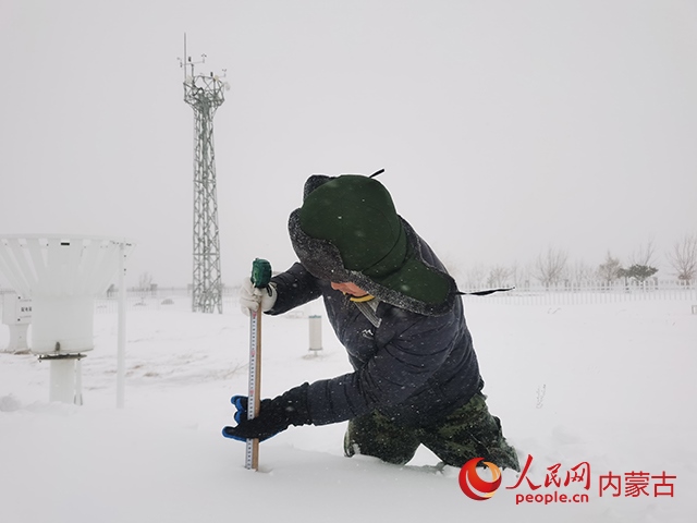 通遼市庫(kù)倫旗氣象局觀測(cè)場(chǎng)工作人員進(jìn)行加密雪深觀測(cè)。白向陽(yáng)攝