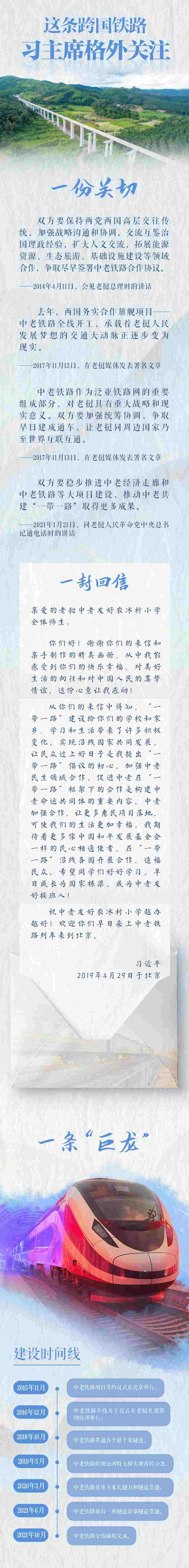 中老鐵路北起中國(guó)昆明,南至老撾萬象,全長(zhǎng)1000多公里。這條承載著友誼、科技、綠色、開放的跨國(guó)鐵路,是我國(guó)“一帶一路”倡議與老撾“變陸鎖國(guó)為陸聯(lián)國(guó)”戰(zhàn)略對(duì)接的重要項(xiàng)目,也是“一帶一路”倡議提出以后,首條以中方為主投資建設(shè)、全線采用中國(guó)技術(shù)標(biāo)準(zhǔn)、使用中國(guó)設(shè)備并與中國(guó)鐵路網(wǎng)直接聯(lián)通的跨國(guó)鐵路。對(duì)于這條鐵路,習(xí)近平主席一直格外關(guān)注。他與老撾高層多次就中老鐵路建設(shè)進(jìn)行深入溝通,并給老撾萬象中老友好農(nóng)冰村小學(xué)師生回信,歡迎他們?cè)缛粘松现欣翔F路列車來到北京。
