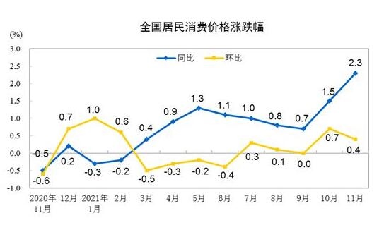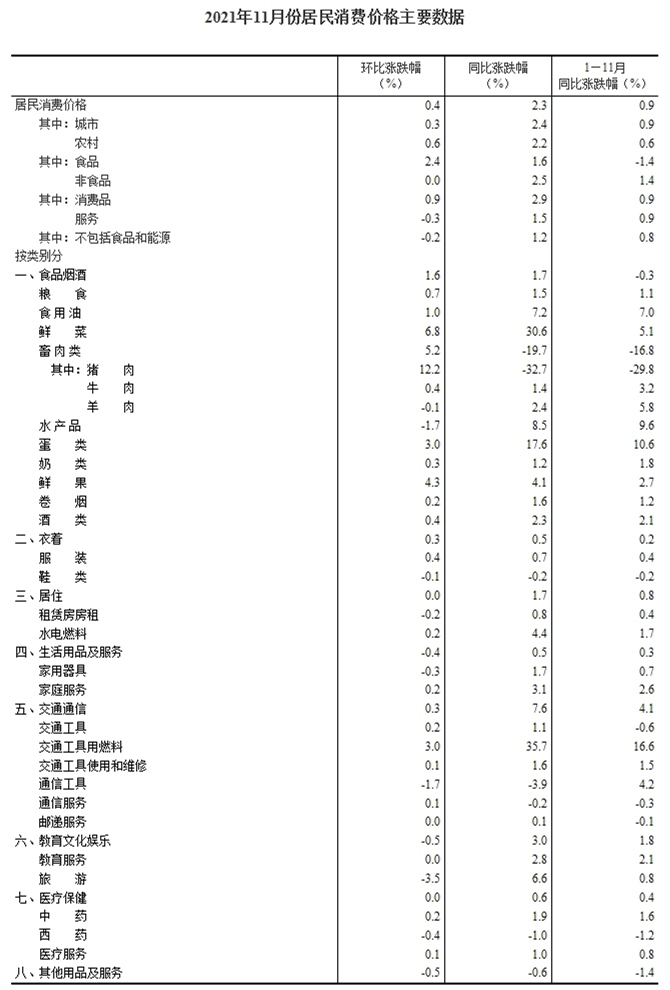 據(jù)國(guó)家統(tǒng)計(jì)局網(wǎng)站消息,2021年11月份,全國(guó)居民消費(fèi)價(jià)格同比上漲2.3%。其中,城市上漲2.4%,農(nóng)村上漲2.2%;食品價(jià)格上漲1.6%,非食品價(jià)格上漲2.5%;消費(fèi)品價(jià)格上漲2.9%,服務(wù)價(jià)格上漲1.5%。1—11月平均,全國(guó)居民消費(fèi)價(jià)格比上年同期上漲0.9%。