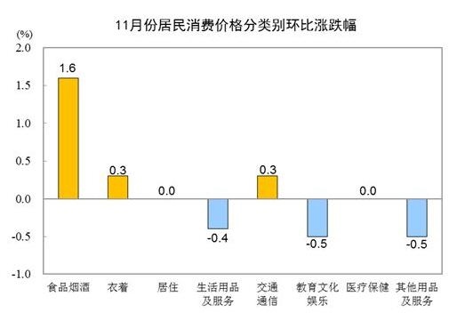 11月份,全國(guó)居民消費(fèi)價(jià)格環(huán)比上漲0.4%。其中,城市上漲0.3%,農(nóng)村上漲0.6%;食品價(jià)格上漲2.4%,非食品價(jià)格持平;消費(fèi)品價(jià)格上漲0.9%,服務(wù)價(jià)格下降0.3%。