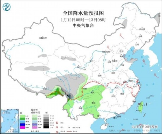 1月12日8時至13日8時,黑龍江東北部、遼東半島、西藏東部、青海南部、山東半島、川西高原、云南西北部等地部分地區(qū)有小到中雪,其中,西藏東南部、云南西北部等地部分地區(qū)有大到暴雪,局地有大暴雪。西南地區(qū)東部、廣西西部、臺灣島等地部分地區(qū)有小到中雨,局地有大雨。內(nèi)蒙古東南部等地部分地區(qū)有4~5級風。