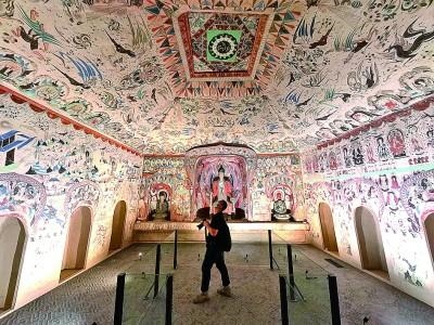 2021年9月17日,參觀者在北京故宮展覽的敦煌莫高窟第285窟復制洞窟內(nèi)參觀。新華社發(fā)