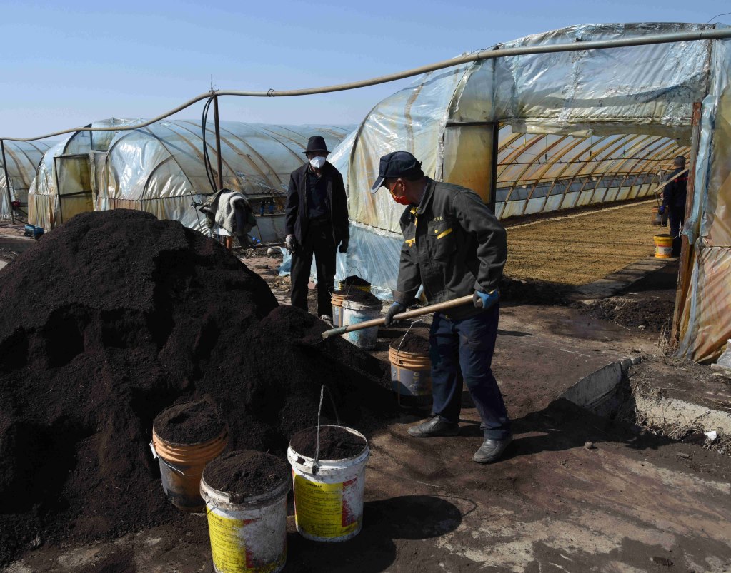 4月2日,在五常市友好村烏拉巴街屯,村民正在將土運(yùn)進(jìn)大棚。新華社記者梁書斌攝