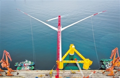 由中國(guó)船舶集團(tuán)海裝風(fēng)電股份有限公司牽頭,聯(lián)合相關(guān)單位自主研制的“扶搖號(hào)”浮式風(fēng)電機(jī)組浮體平臺(tái)上配備6.2兆瓦抗臺(tái)型I類風(fēng)力發(fā)電機(jī)組,在深遠(yuǎn)海應(yīng)用場(chǎng)將依靠九個(gè)對(duì)稱分布的懸錨鏈系泊實(shí)現(xiàn)固定。圖為完成總裝的國(guó)內(nèi)首臺(tái)深遠(yuǎn)海浮式風(fēng)電裝備“扶搖號(hào)”在茂名廣港碼頭靜待拖航(無人機(jī)照片)。記者劉大偉攝