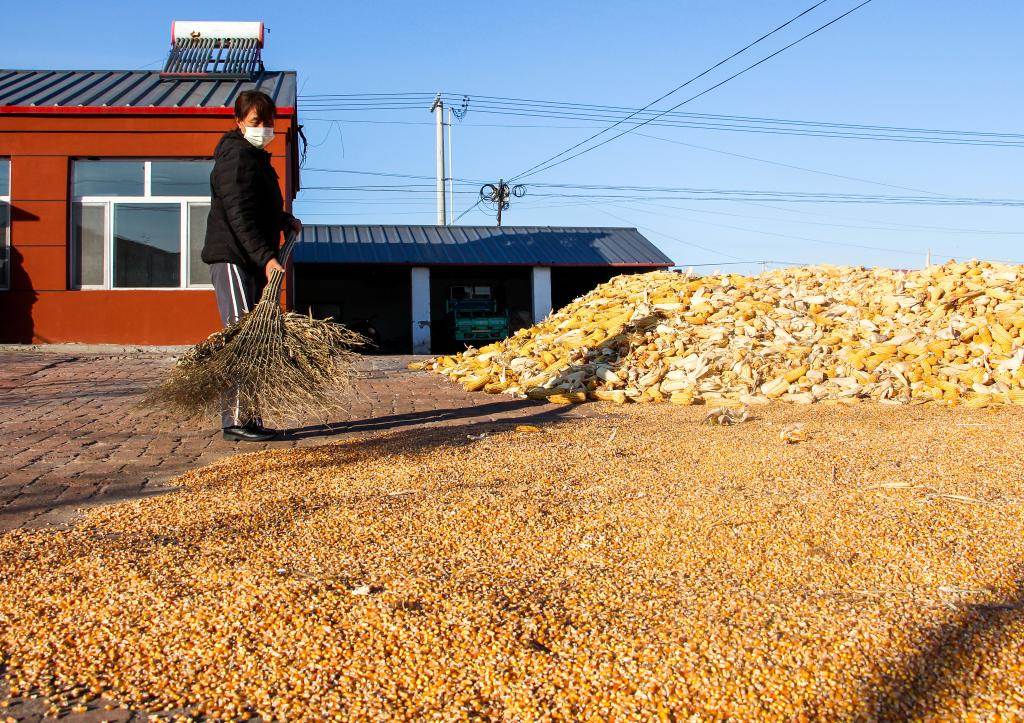 11月3日,在內(nèi)蒙古自治區(qū)通遼市開魯縣開魯鎮(zhèn)飛機(jī)場(chǎng)村,一名村民在院中晾曬玉米。 新華社記者連振 攝