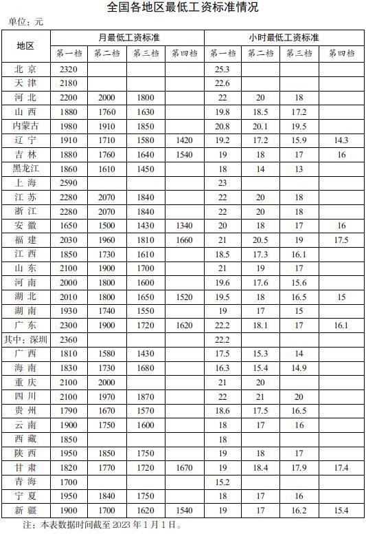 全國各地區(qū)最低工資標準情況(截至2023年1月1日),來自人社部網(wǎng)站