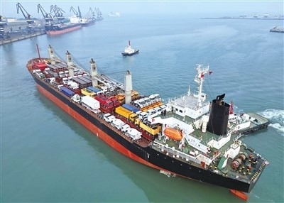 2月23日,中非班輪“塔內(nèi)斯夢想”輪從山東港口煙臺港起航,前往坦桑尼亞達累斯薩拉姆港。 唐 克攝(人民圖片)