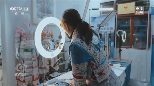 △化屋村苗繡產(chǎn)業(yè)帶頭人楊文麗在網(wǎng)絡(luò)直播間直播。