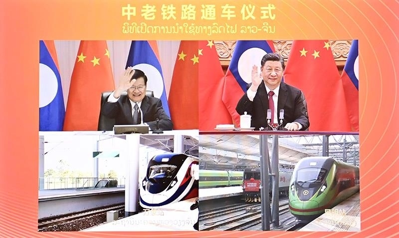 △2021年12月3日,中共中央總書記、國家主席習近平在北京同老撾人民革命黨中央總書記、國家主席通倫通過視頻連線共同出席中老鐵路通車儀式。