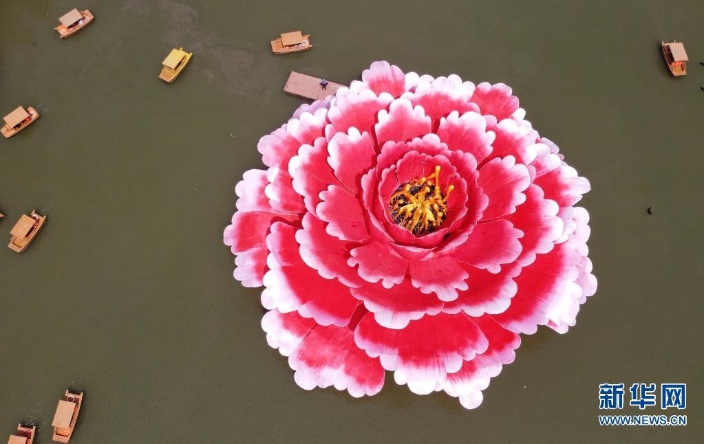 近日,在河南省洛陽市隋唐城遺址植物園,一座直徑36米、高13米的巨型牡丹景觀造型亮相滴翠湖,吸引游客前來觀賞。   新華社發(fā)(黃政偉 攝)